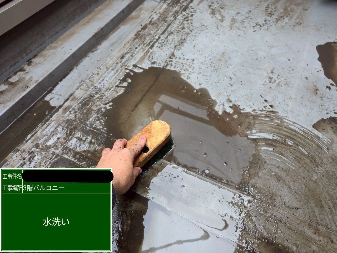 まずは敷材を剥がし、既存の防水層を水洗いを行い、表面の汚れや埃をしっかりと除去します。