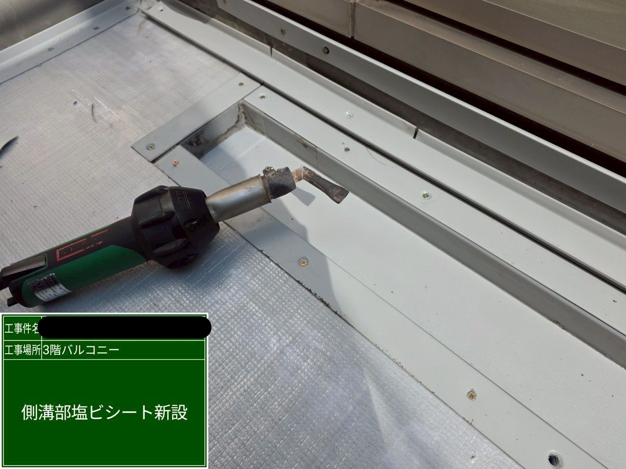 平場(床面)だけではなく、側溝部の塩ビシートも新設し、防水性能をしっかりと確保していきます。