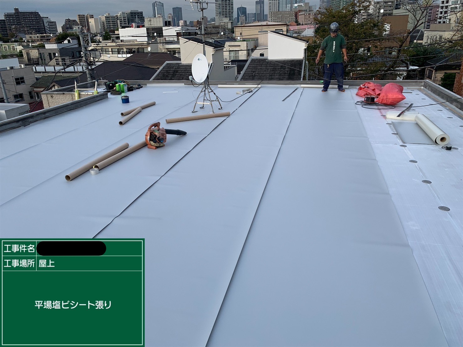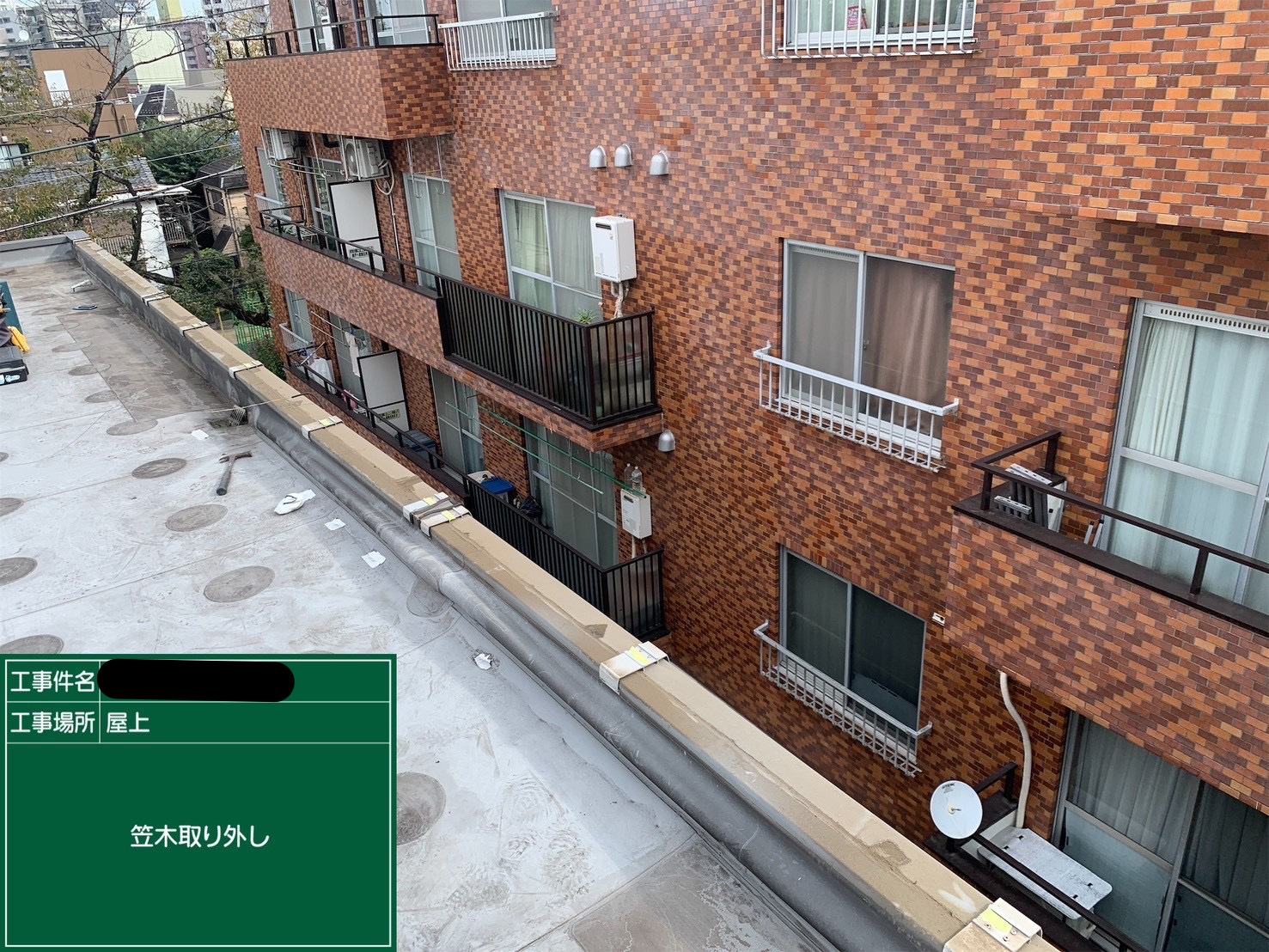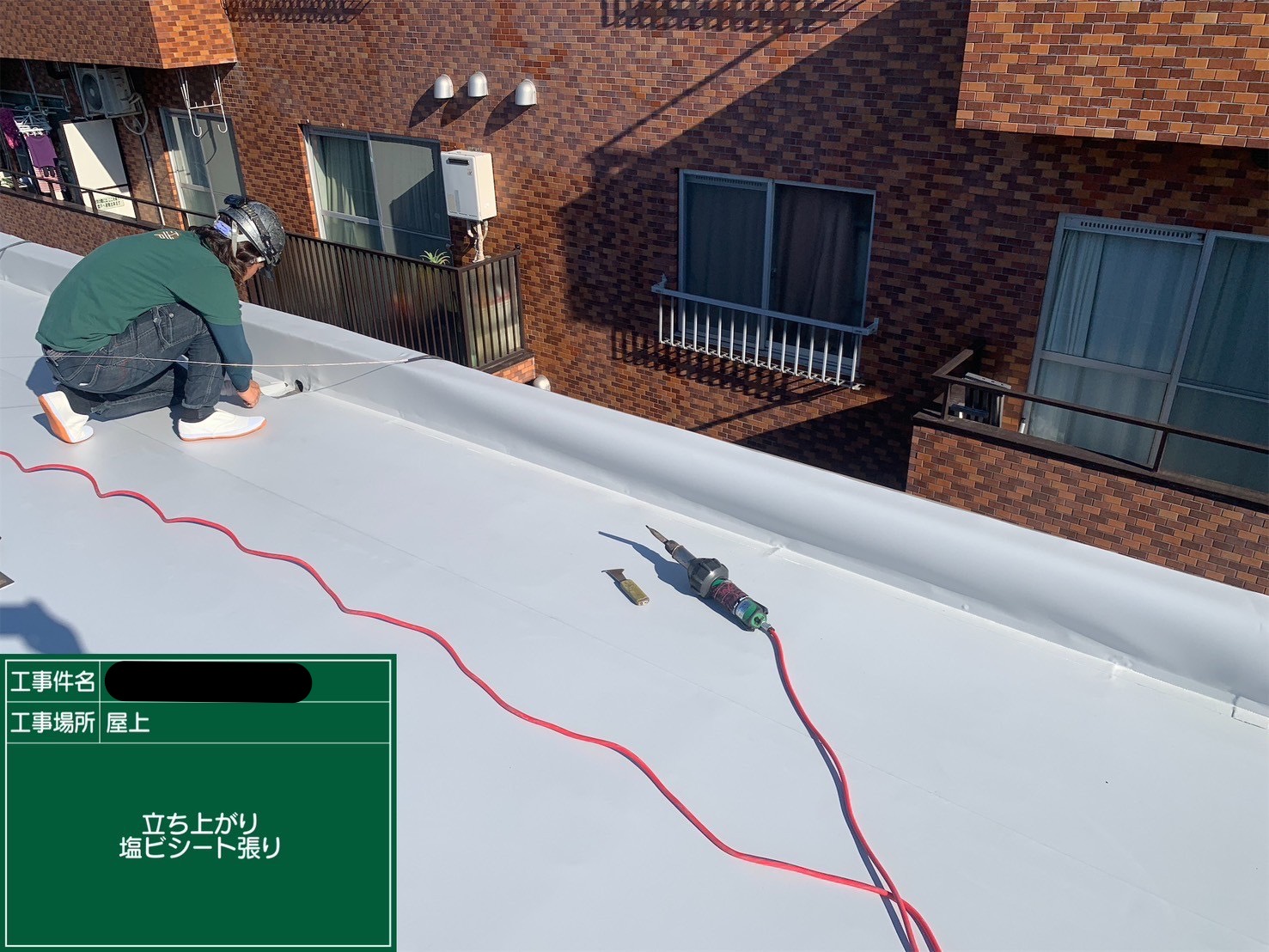 他社さんではこの脱着を避けがちですが、江戸ワークでは自社職人が笠木の脱着から復旧まで一貫対応できるため、塩ビシートと笠木の取り合い部分まで完全に施工することが可能です。