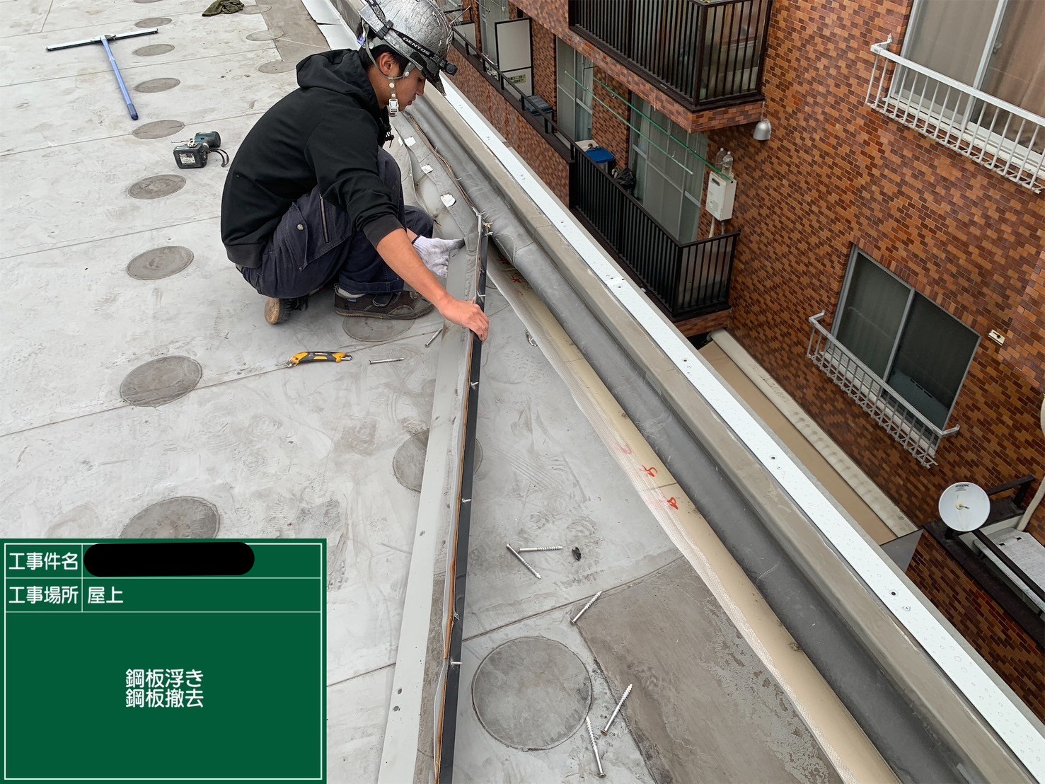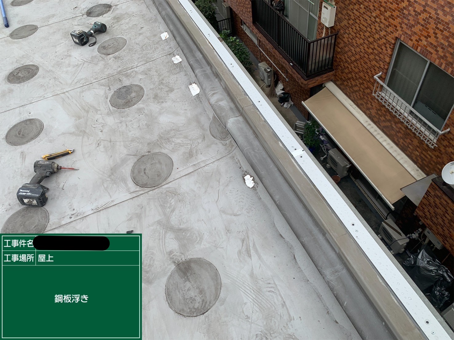 ・屋上全体で経年劣化が進んでおり、既存鋼板が浮いて塩ビシートを引っ張ている状態