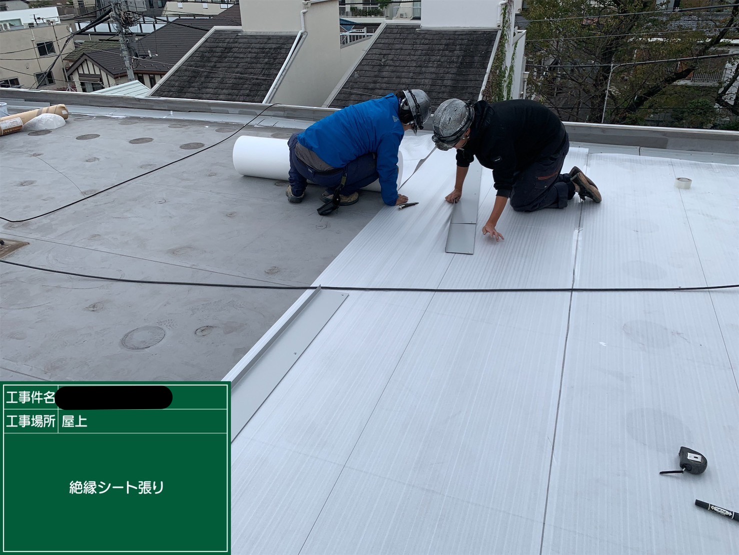 今回は笠木の下にもしっかりと新しい塩ビシートを巻き込み、雨水の侵入経路をゼロにする施工を行いました。