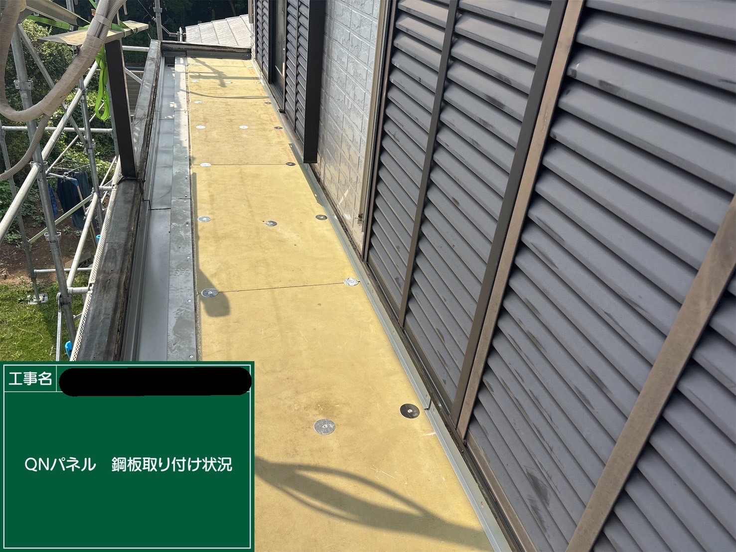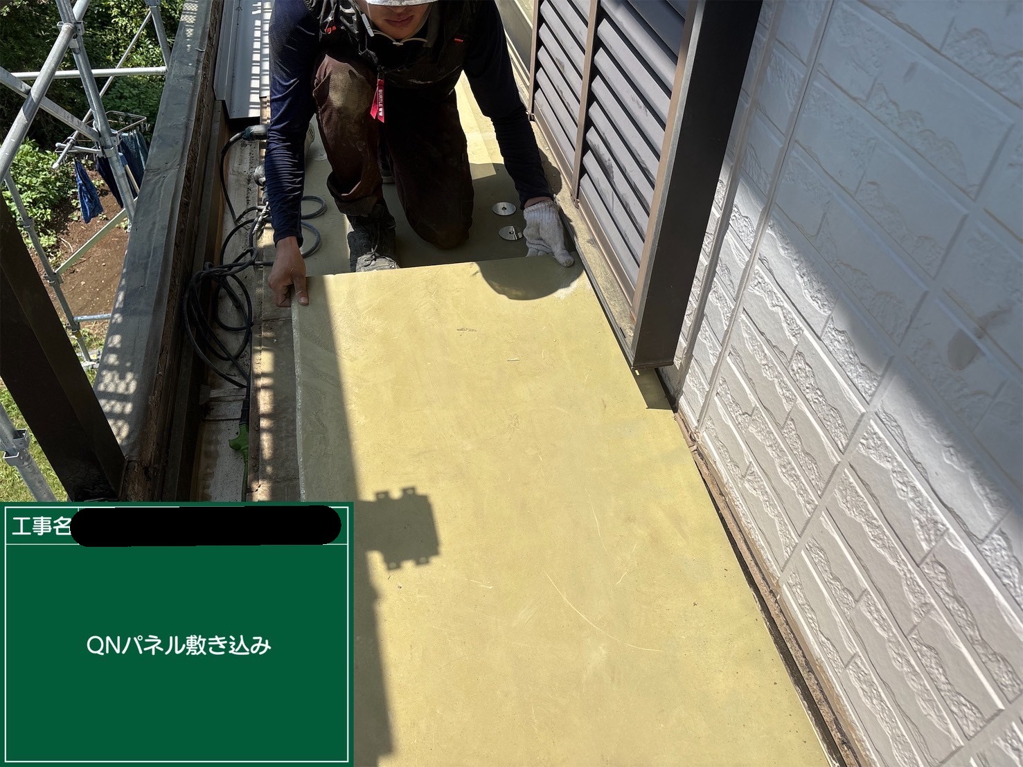 ・不燃性のQNボードを敷き、歩行する為の下地の強化と、既存の防水シートとの、関わりを無くし新しい塩ビシートの劣化を防ぎます。