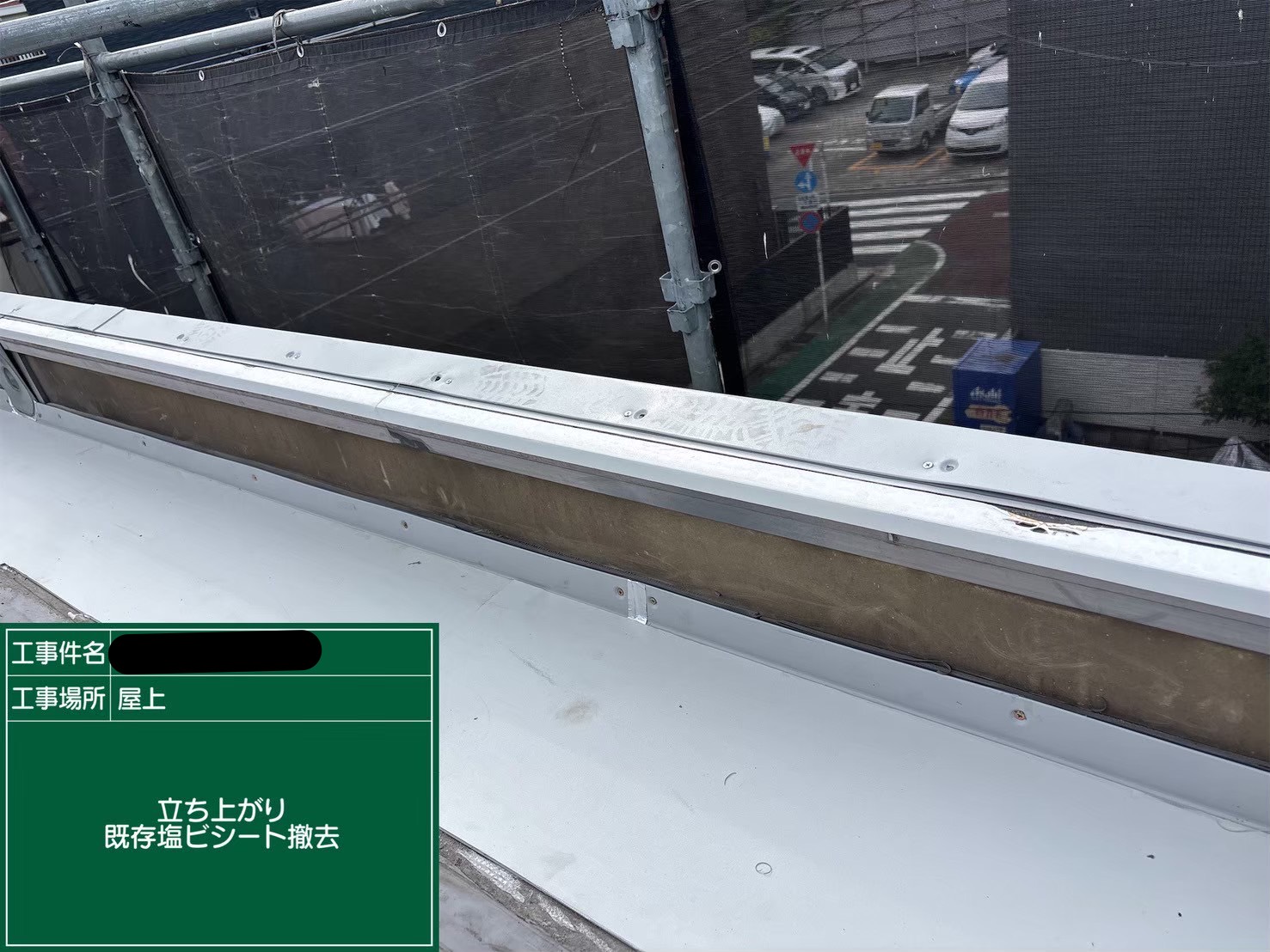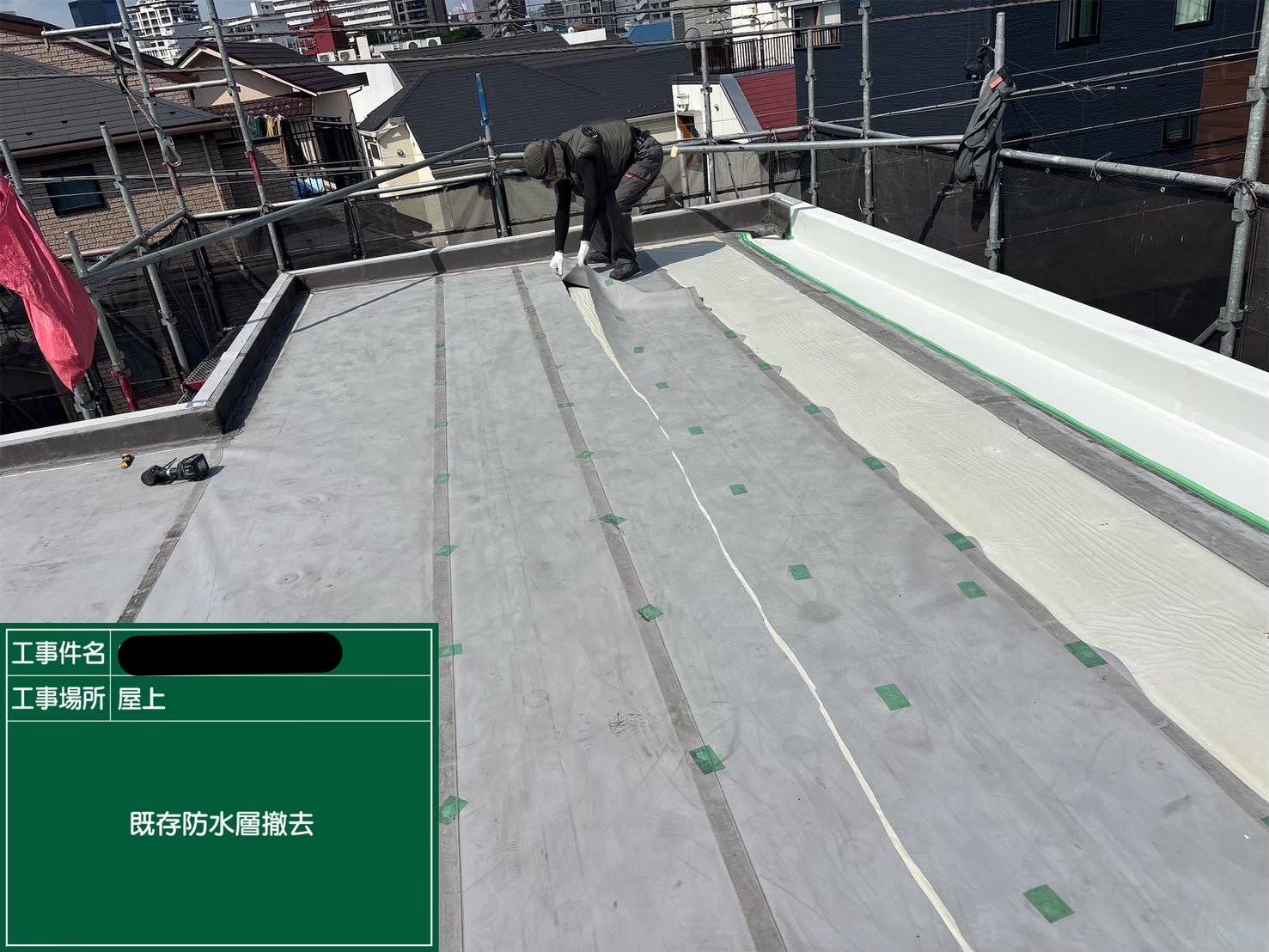 古い防水層を残してしまうと、改修工事後の膨れ、劣化を早める原因になってしまうため、徹底した下地処理を行いました。