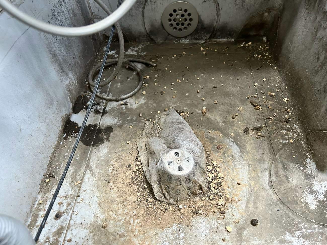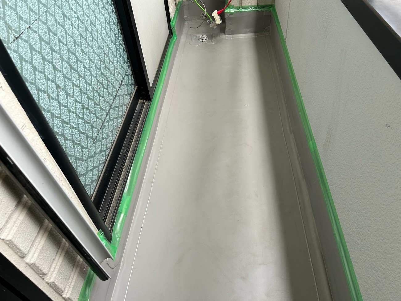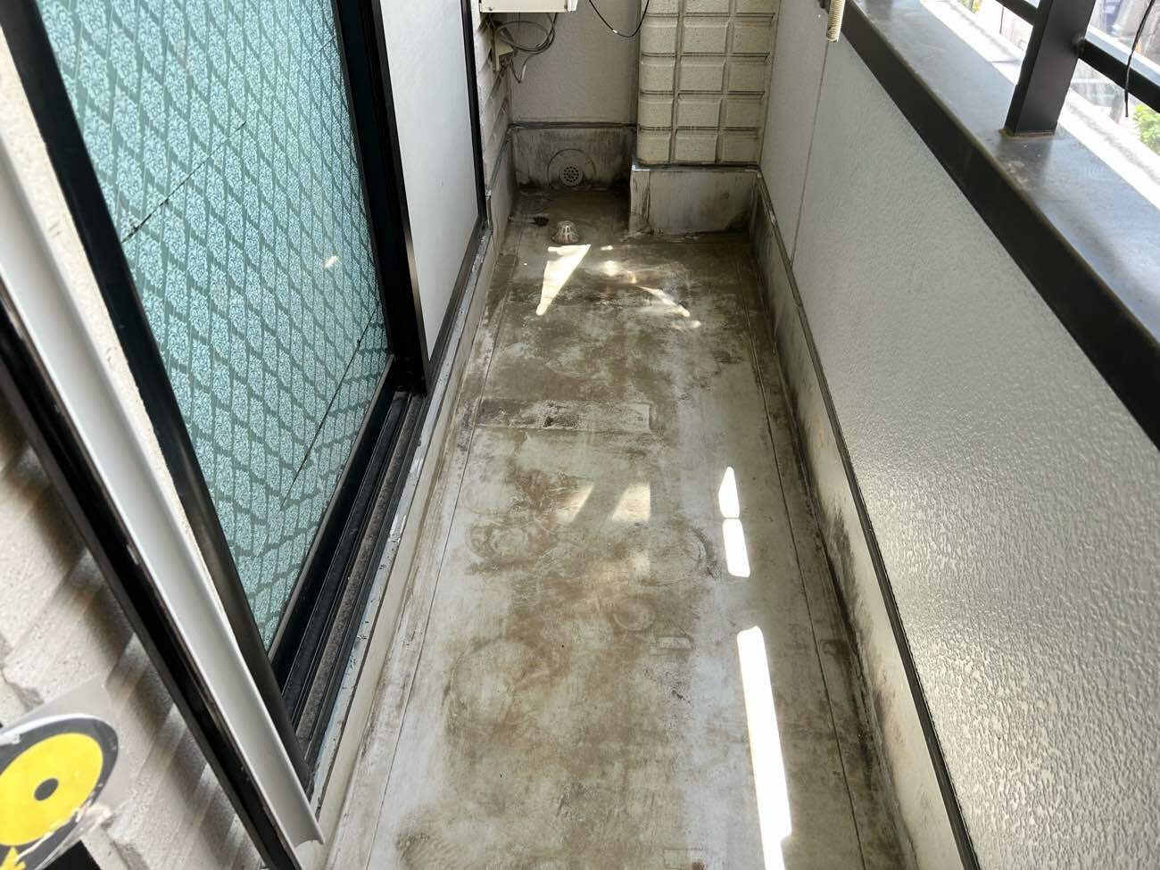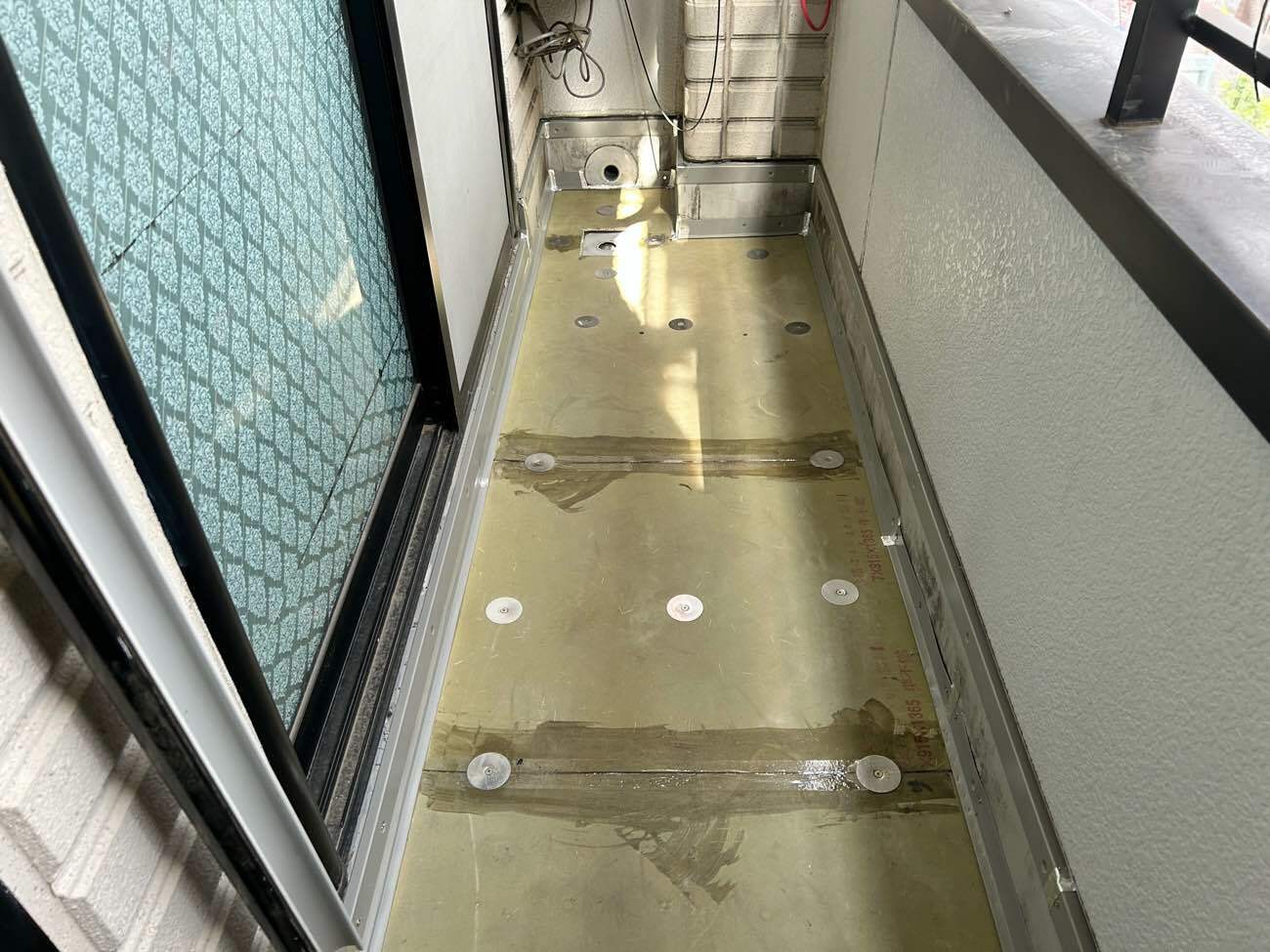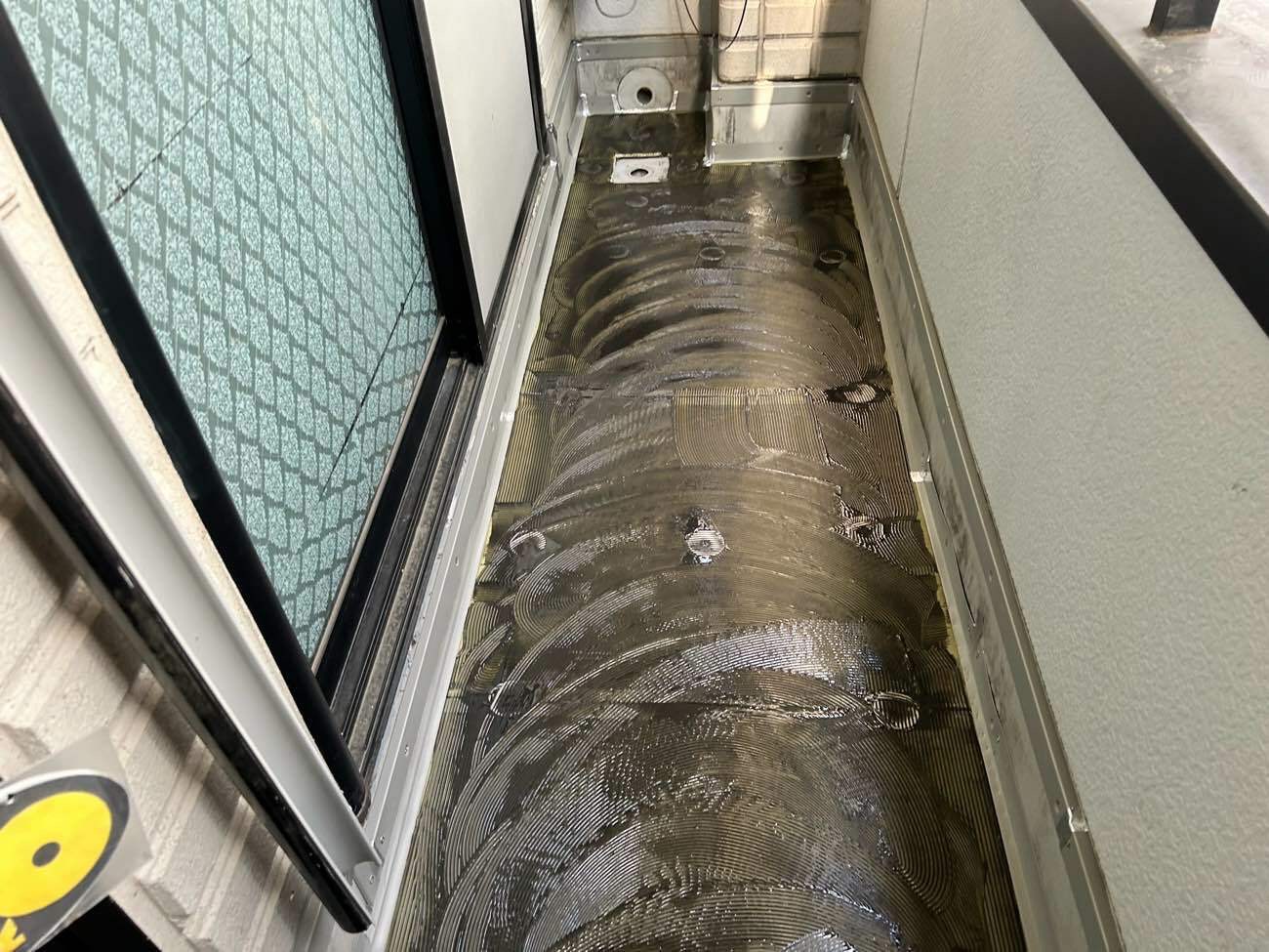 バルコニーの植栽が多いので、足場に固定し、安全に作業出来るようにします。また、土が施工する際、新設する塩ビシートに影響がでてきてしまう為、既存の塩ビシートを清掃します。この時、稀に既存の塩ビシートが破れているが、土でなんとか塞がれている状況があります。その際、確認しないで水洗いなどをしてしまいますと、漏れてしまう危険性がありますので細心の注意を払って清掃致します