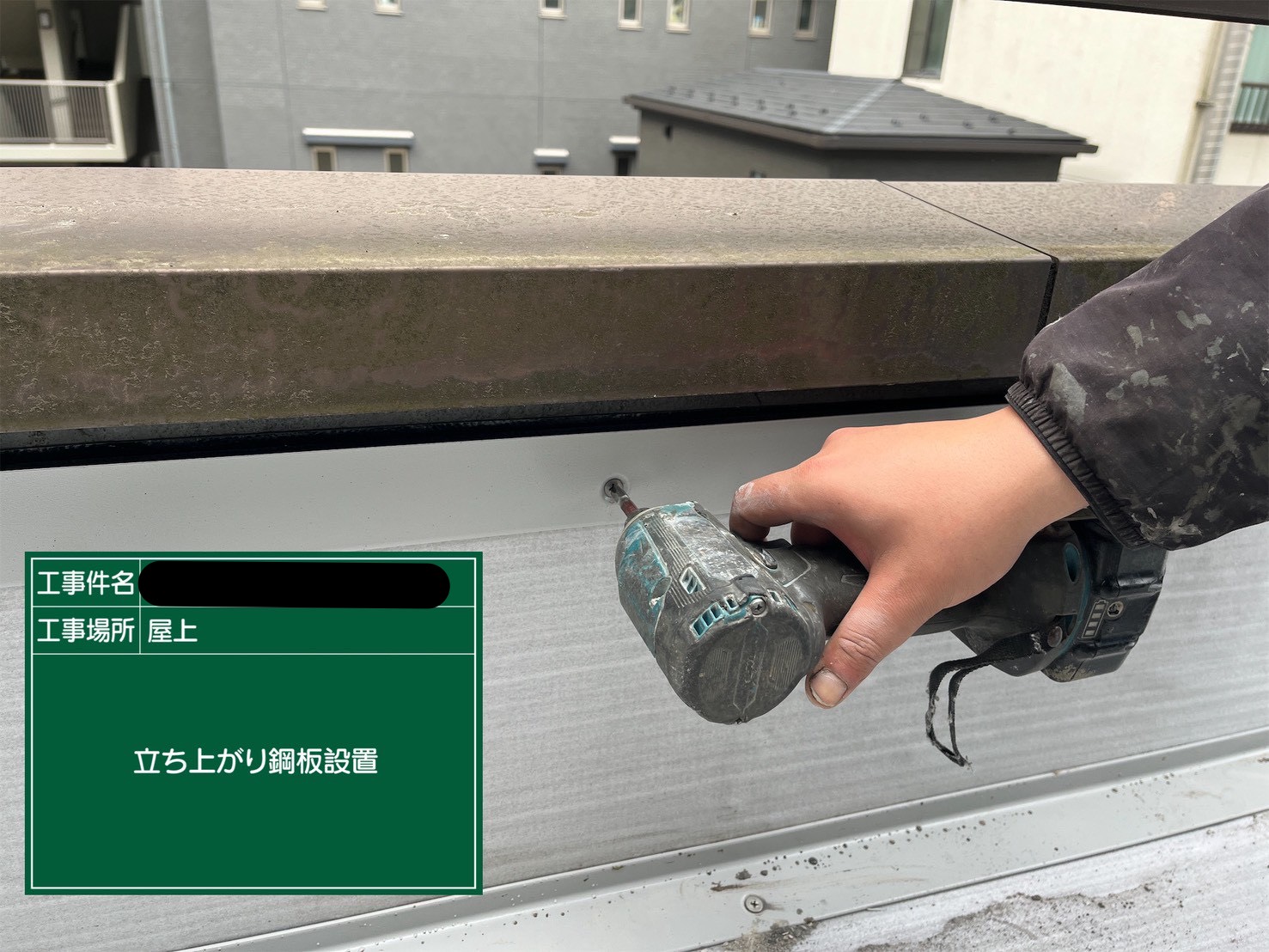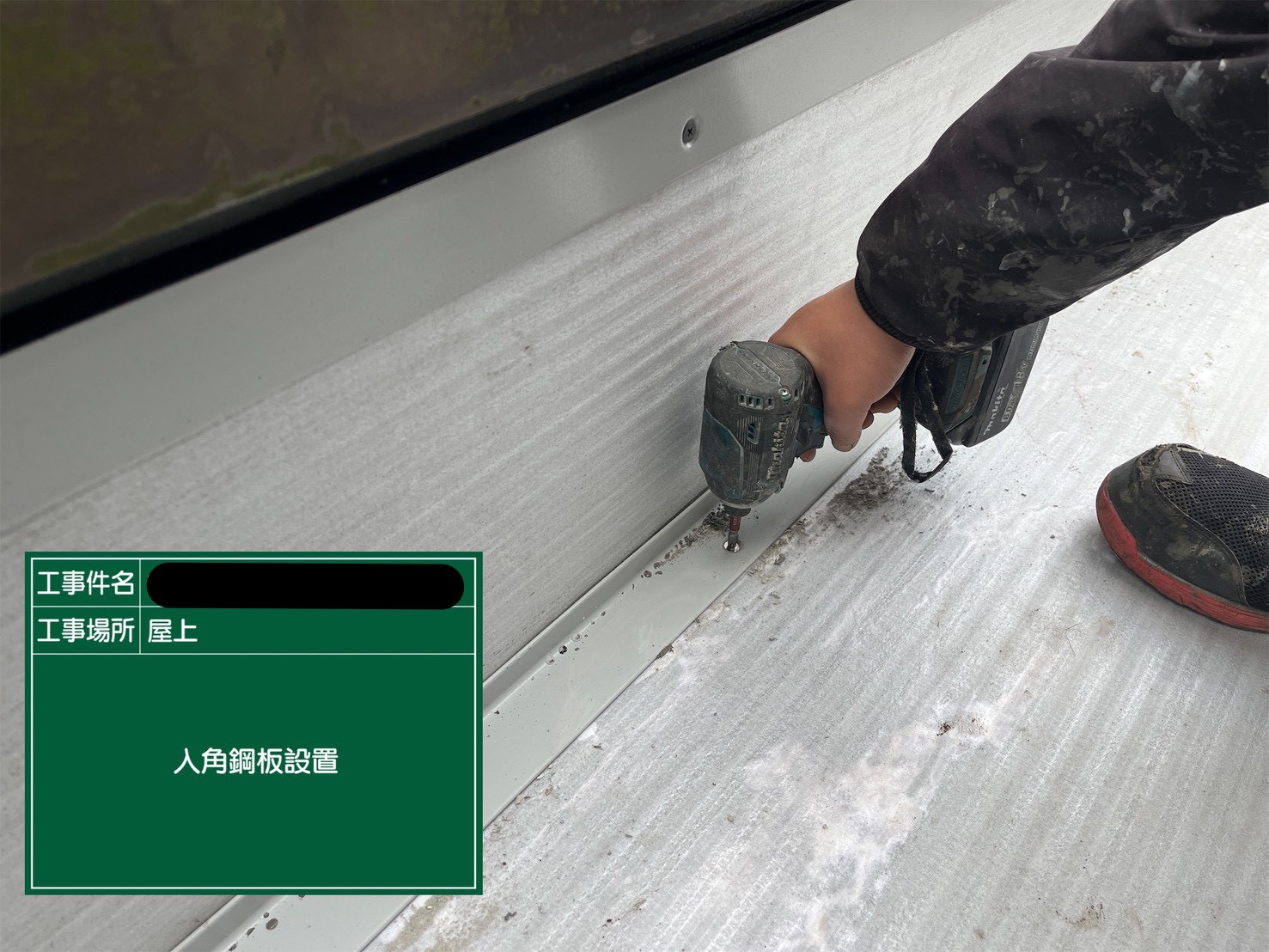 立上り部の鋼板設置にあたっては、鋼板下にブチルテープを張り込み、ビス固定部からの水の回り込みを防ぐため、見えなくなる部分こそ確実に処理しています。