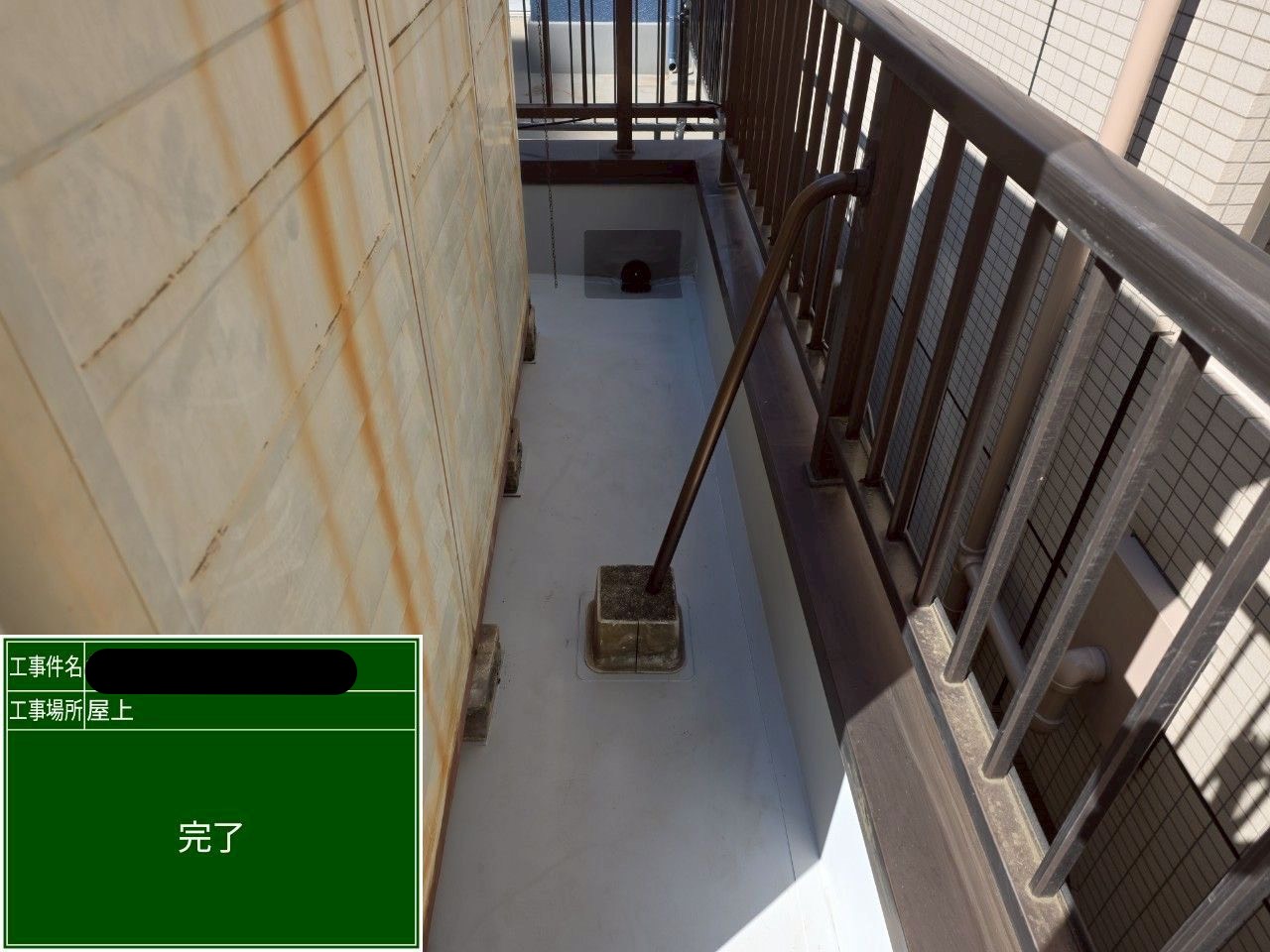 今回のお建物は既存が‘‘ウレタン防水‘‘でしたが、ウレタン防水は定期的なトップコートの塗り替えメンテナンスが必要です。